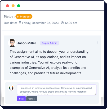 BrainCert enhances course engagement with an intuitive assignment feature. Instructors can easily assign tasks, manage submissions, and interact with learners in a forum-style setting, elevating the learning experience.